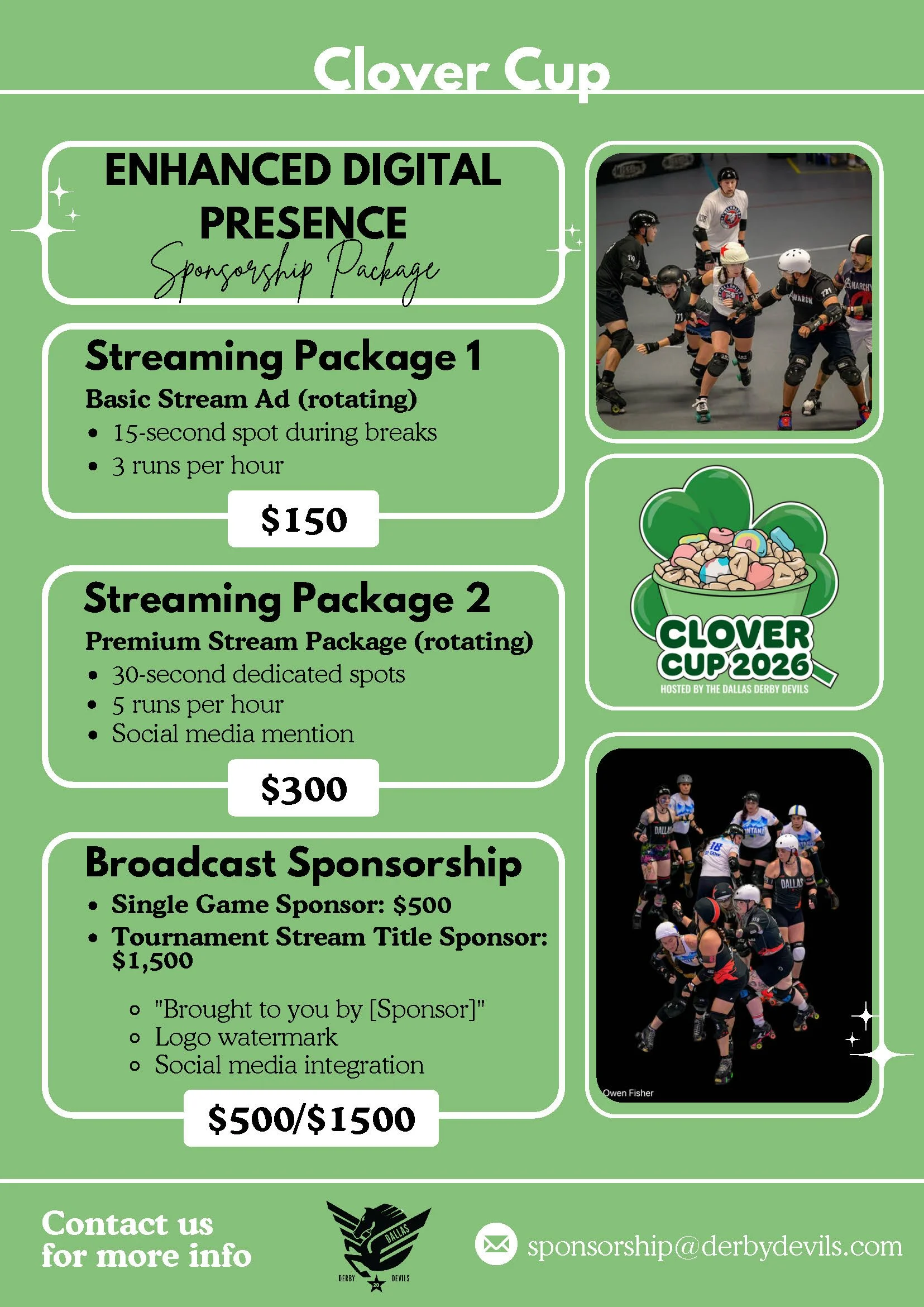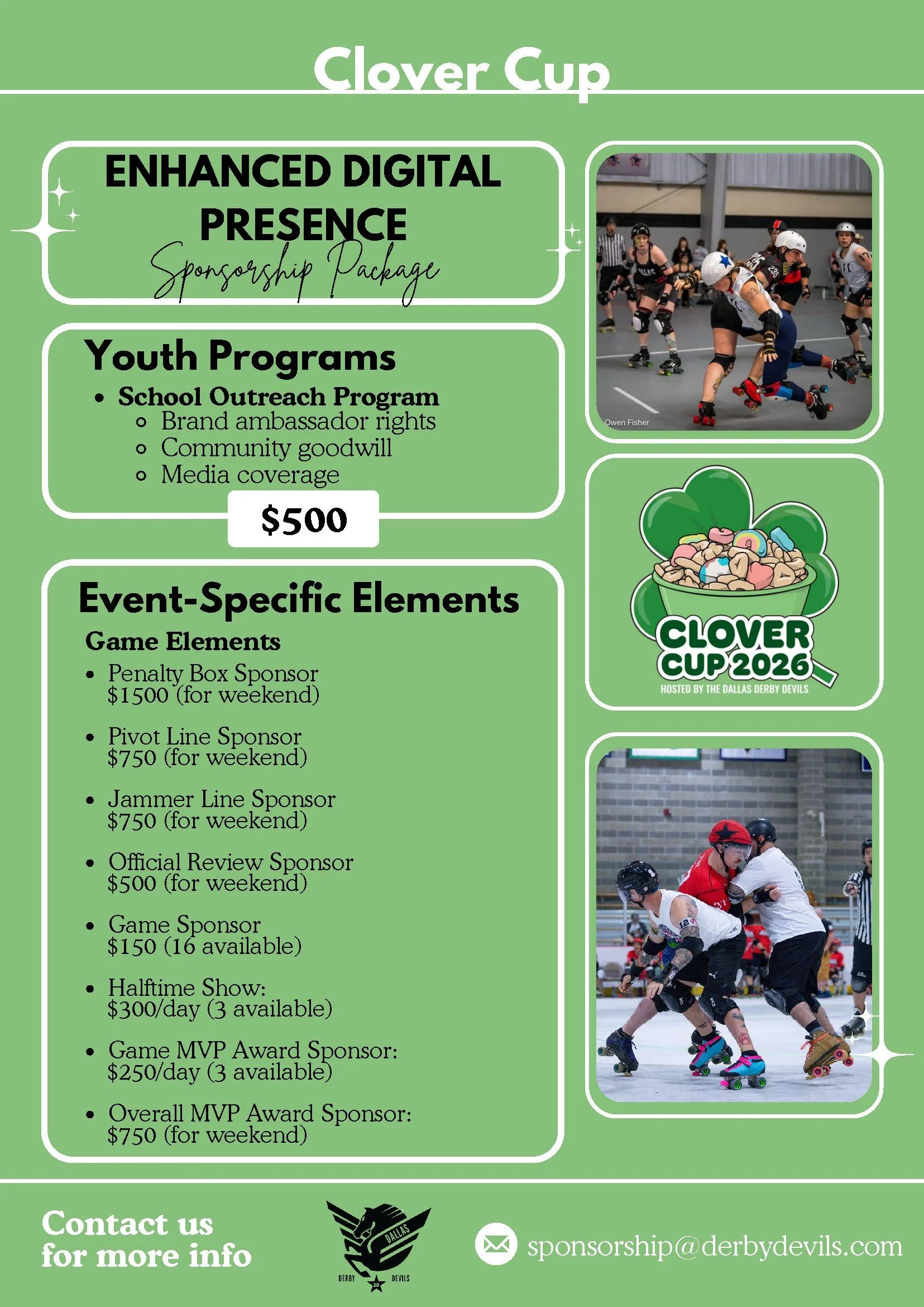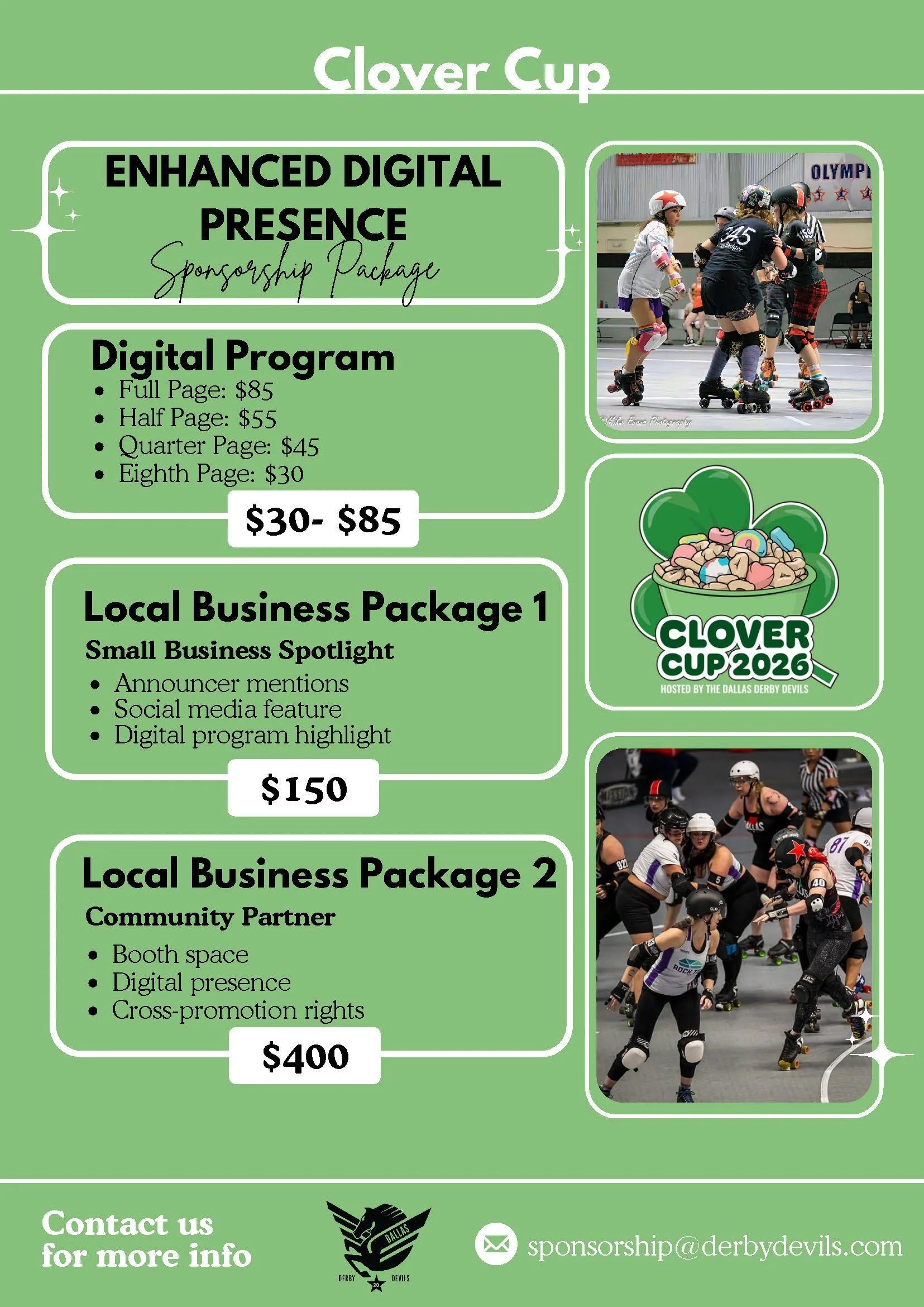 To purchase your sponsorship, please send your payment using the form below, then send an email to sponsorship@derbydevils.com letting us know which packages you’ve purchased and that you’ve sent your payment via the Clover Cup website.